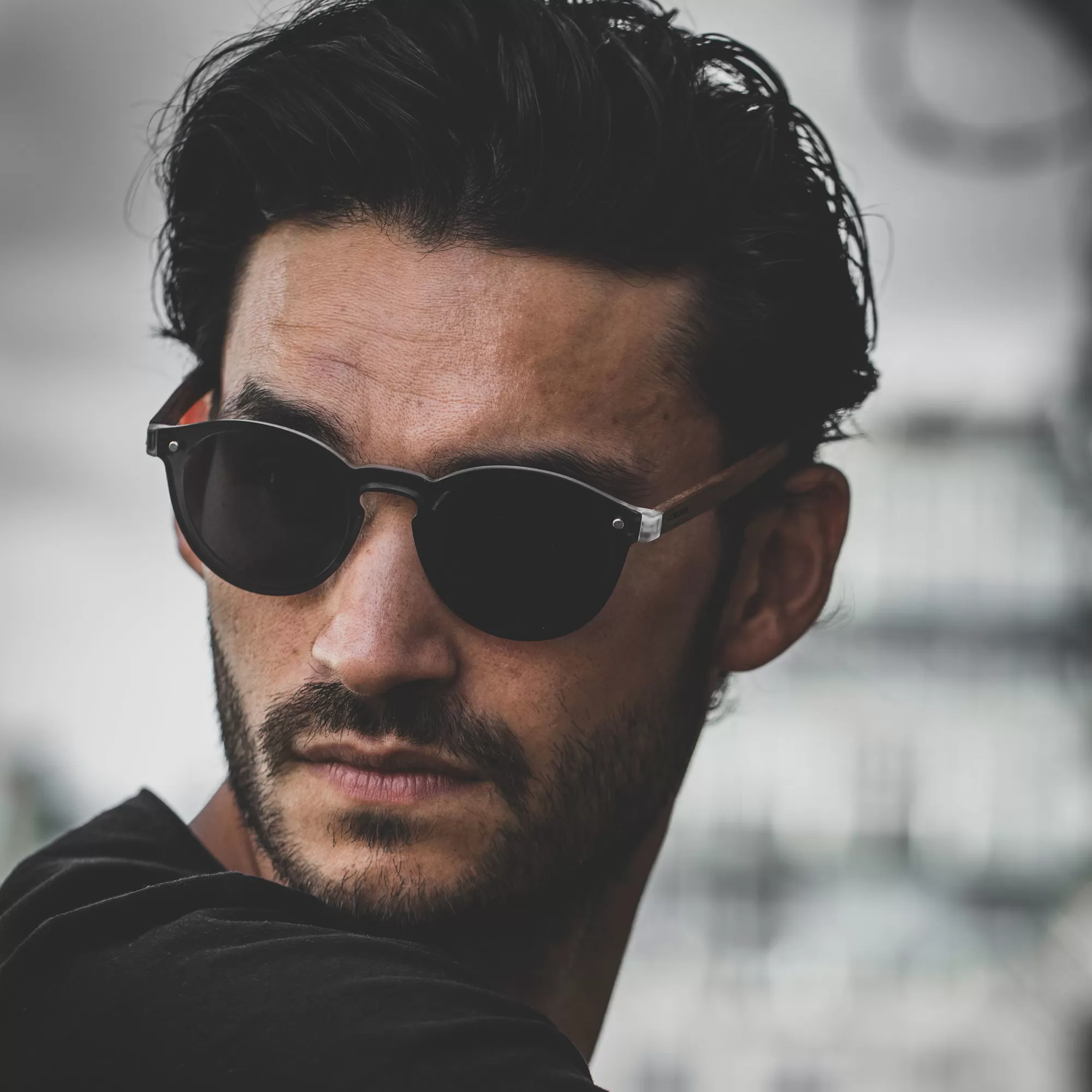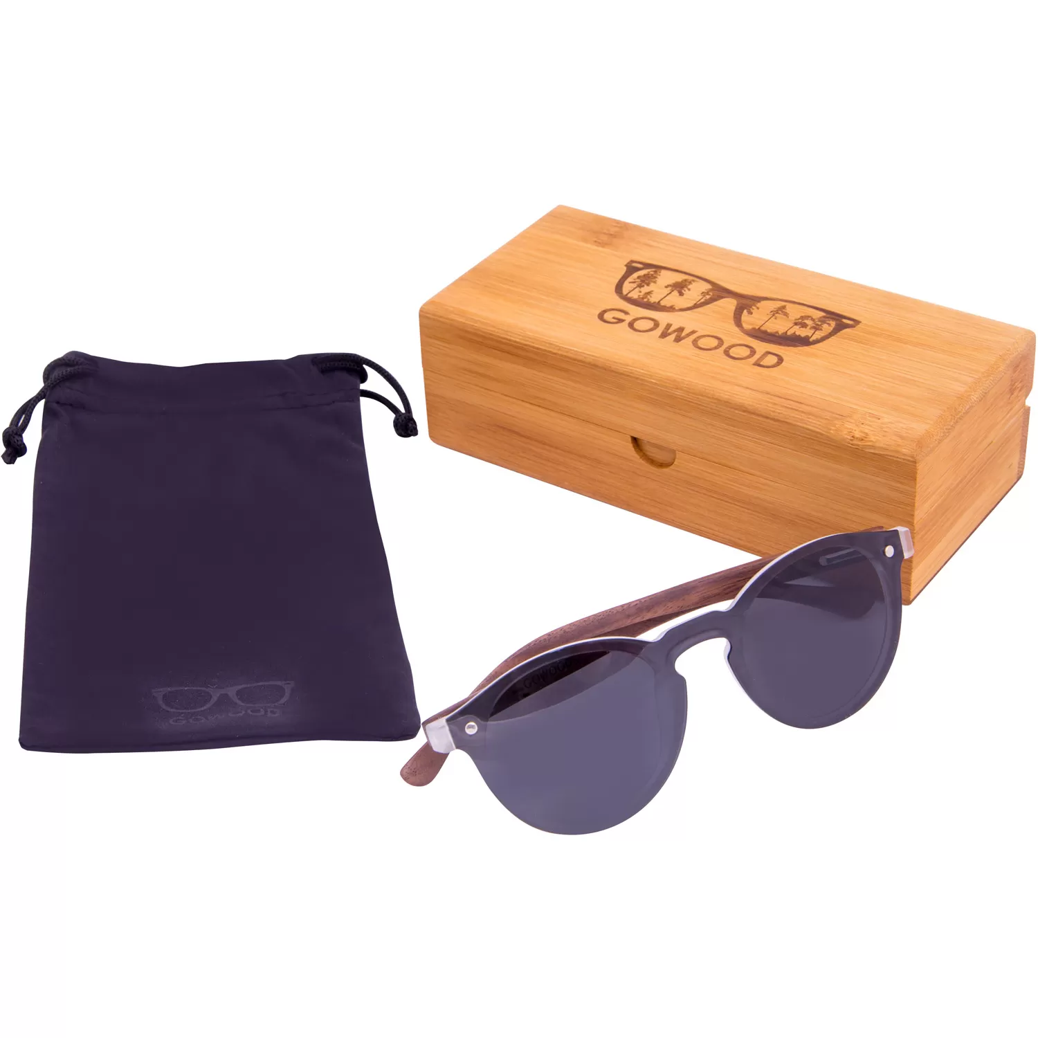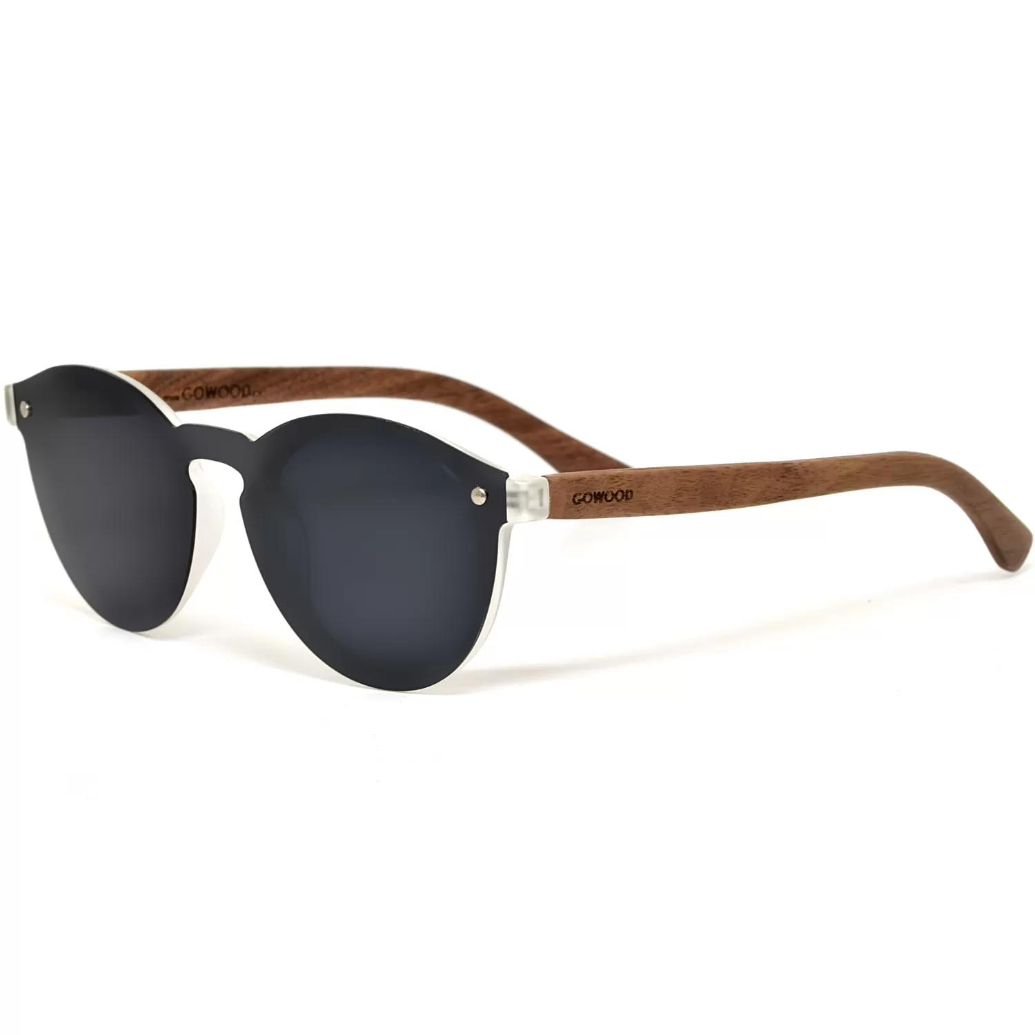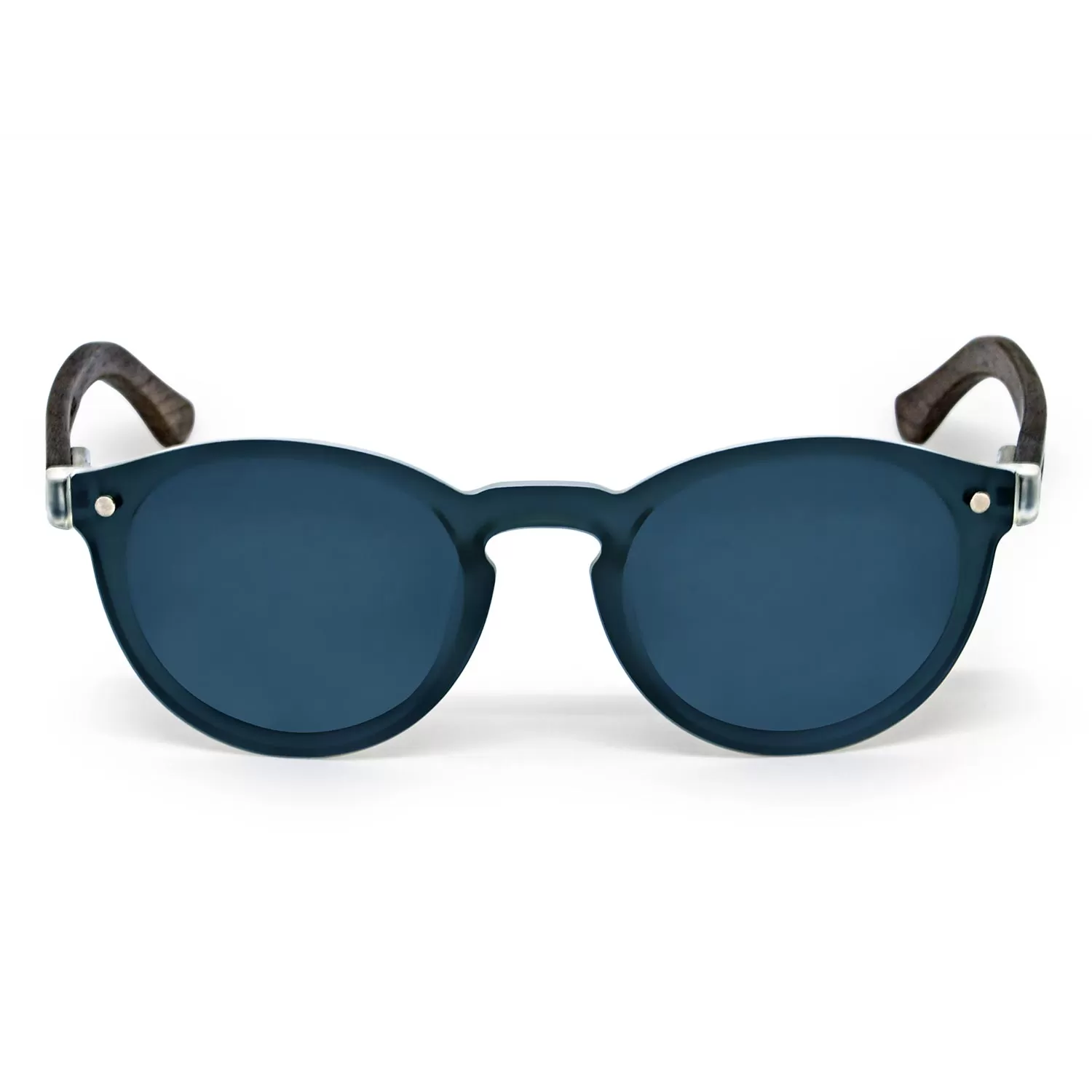 Round walnut wood sunglasses with special one piece polarized dark grey lens ‘Rio IV’